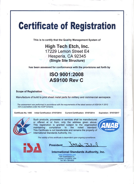 High Tech Etch can offer you great pricing, excellent service, and quality. The company's quality record is one of the best in the industry. We are Nadcap and ISO9001: 2008/AS9100D certified. We are located in Hesperia, California approximately 90 miles northeast of Los Angeles; we offer free pick-up and delivery in the greater Orange County and Los Angeles County area.
