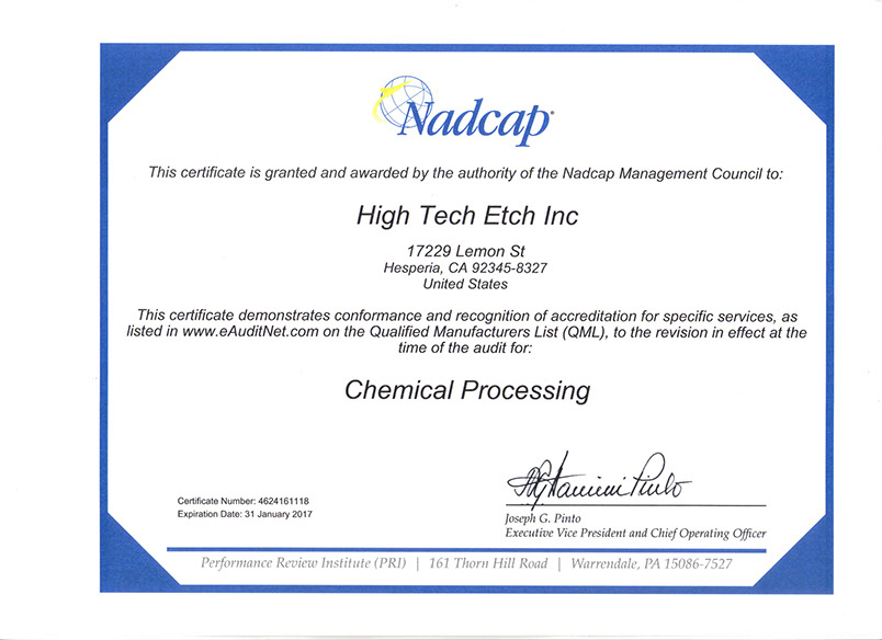 High Tech Etch can offer you great pricing, excellent service, and quality. The company's quality record is one of the best in the industry. We are Nadcap and ISO9001: 2008/AS9100D certified. We are located in Hesperia, California approximately 90 miles northeast of Los Angeles; we offer free pick-up and delivery in the greater Orange County and Los Angeles County area.